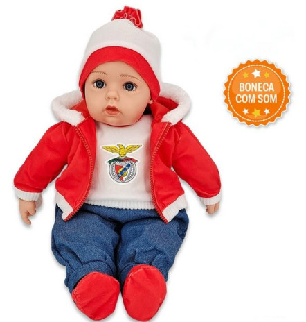 Boneco Bebe com gorro do SLB que emite som e com chucha.