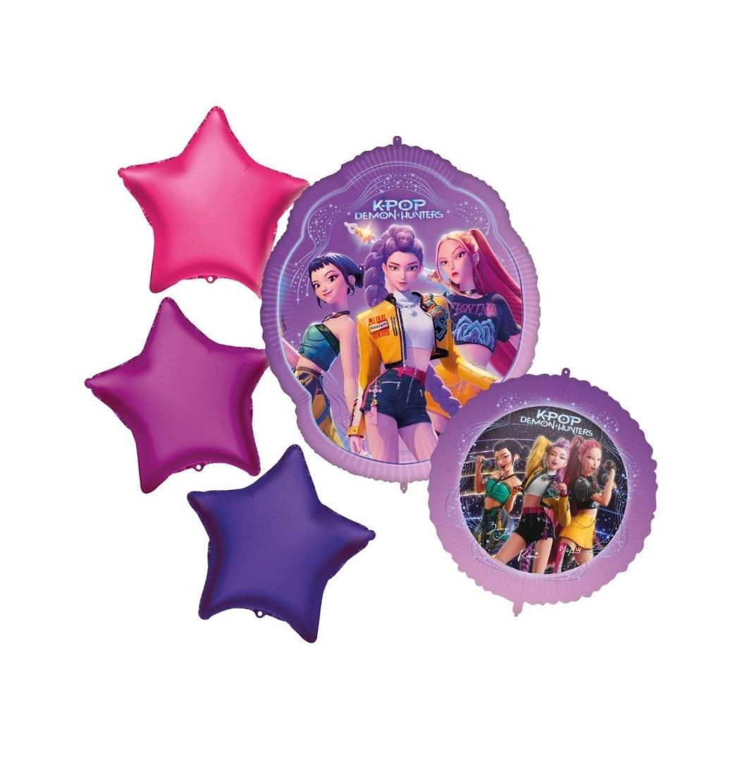 Conjunto de 5 balões que perfazem um bouquet para festas de aniversário Huntrix Kpop Demon Hunters.