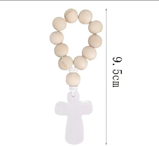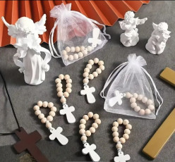 Conjunto de contas de oração de madeira,do rosário em bege, com cruz branca e saquinho de organza, adequado para presentes de chá de bebê, presentes de aniversário, presentes de batismo/batizado, brinde de primeira comunhão ou profissão de fé.