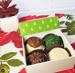 Caixa em cartão para colocar 4 brigadeiros de natal ou outros pequenos doces. Com tampa transparente para poder ver o que tem lá dentro. Inclui divisórias (forma pétala em branco).