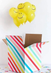 Caixa em cartão branco com a inscrição "Be Happy" para colocar 1 balão ou vários, com hélio, para surpreender alguém.
