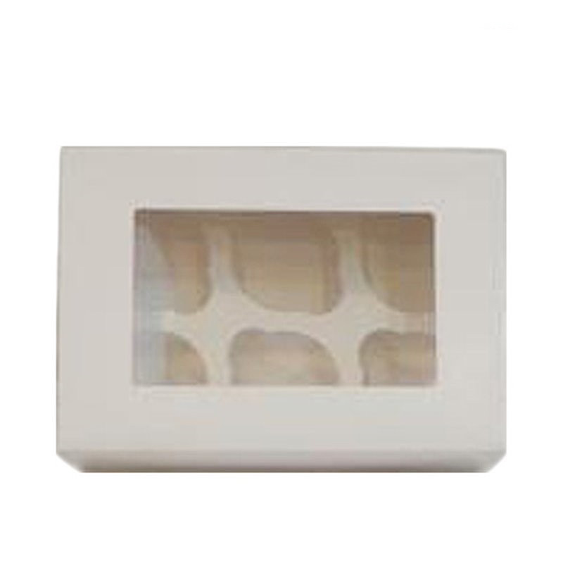 Caixa branca para transportar seis cupcakes. Com transparência para poder ver o que tem lá dentro. E base anti movimento, para os cupcakes estarem justos.
