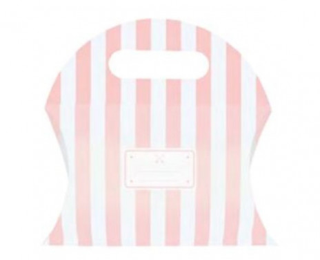 Caixinha multiusos em cartolina às riscas em rosa e branco para brindes ou guloseimas para aniversários ou outras festividades. Vem com uma parte onde se pode personalizar.
