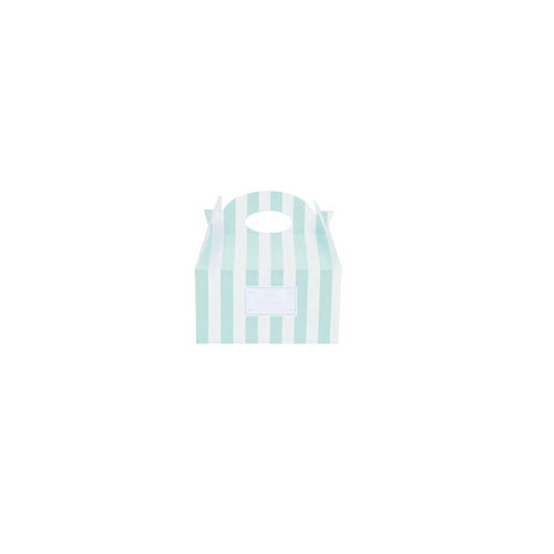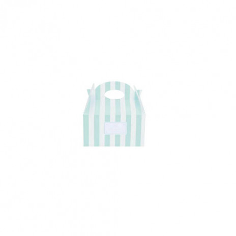 Caixinha multiusos em cartão às riscas em menta e branco para brindes ou guloseimas para aniversários ou outras festividades. Vem com uma parte onde se pode personalizar.