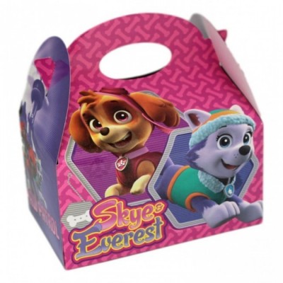 Caixinha de cartão com a cadelinha Skye e Everest para brindes da série Paw Patrol. Para colocar os brindes na tua festa de aniversário.