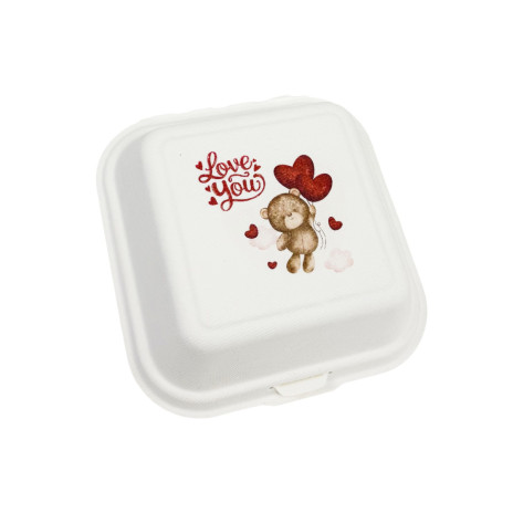 Esta caixa de cana-de-açúcar de 15x15x8cm, da edição “Cupcake Urso do Amor”, é a embalagem perfeita para quem procura uma solução ecológica e cheia de ternura para o Dia dos Namorados. Fabricada em material compostável e amigo do ambiente, esta caixa tipo clamshell encanta pela sua impressão na tampa: um desenho delicado de um urso a segurar balões em forma de coração, complementado pela mensagem romântica “Love You”.