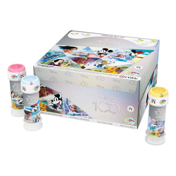 Caixa de 36 bolas de sabão comemorativas do 100º aniversário da Disney. Com estes frascos podes fazer vários tamanhos de bolas de sabão diferentes de uma só vez. Uma ótima e divertida ideia para oferecer como brinde de festa de aniversário.