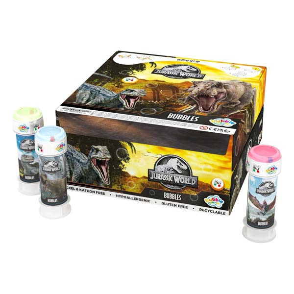 Caixa de 36 bolas de sabão de dinossauros do Jurassic World. Com estes frascos podes fazer vários tamanhos de bolas de sabão diferentes de uma só vez. Uma ótima e divertida ideia para oferecer como brinde de festa de aniversário.