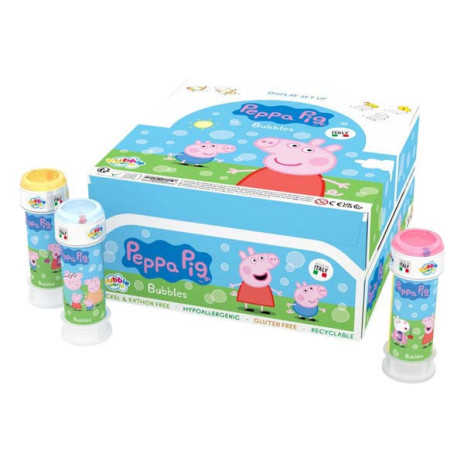Caixa de 36 bolas de sabão da Porquinha Peppa. Com estes frascos podes fazer vários tamanhos de bolas de sabão diferentes de uma só vez. Uma ótima e divertida ideia para oferecer como brinde de festa de aniversário.