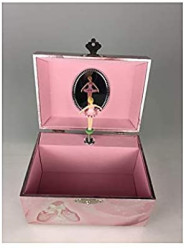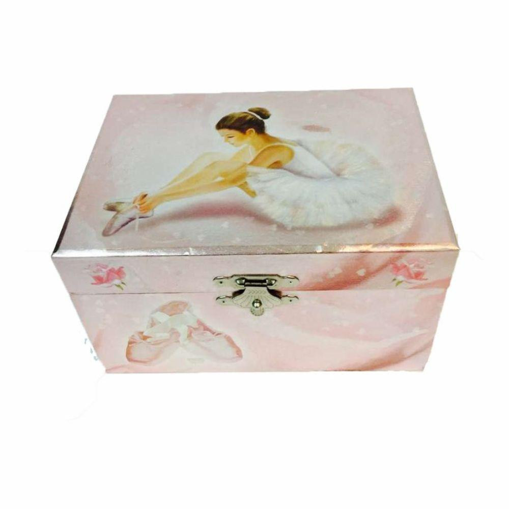 Caixa de jóias em forma de baú com desenho de bailarina de ballet brilhante. Quando levanta a tampa, aparece uma pequena bailarina que dança ao som duma música.