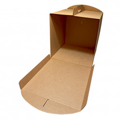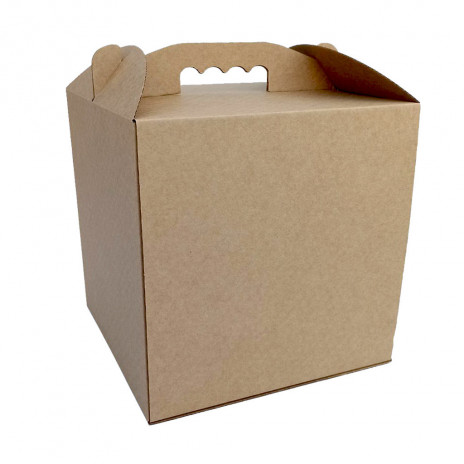 Caixa rectangular em papel kraft para bolos, tortas ou outros doces com a dimensão de 28x28x30cm. Inclui pega de transporte.