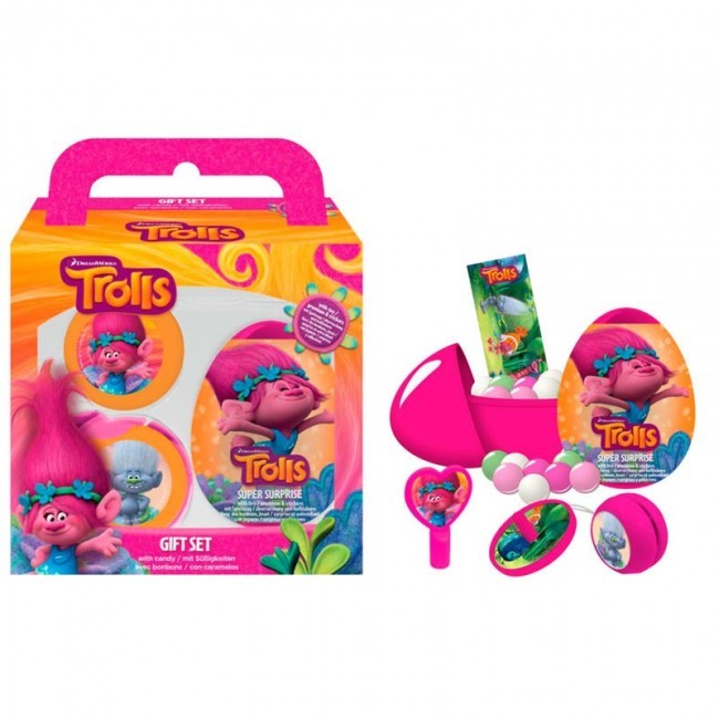 Caixa de presente Trolls com um ovo surpresa e um brinquedo. Cada ovo plástico tem um brinquedo aleatório, um saco de doces e uma tira de autocolantes no interior.