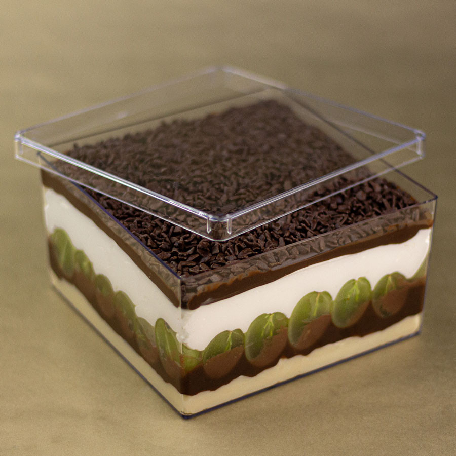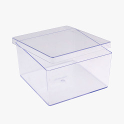 Caixa quadrada com tampa, feita em poliestireno cristal (material mais resistente do que acrílico).