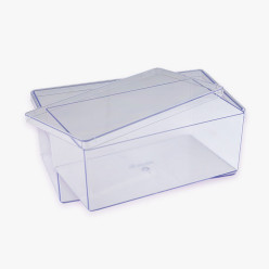 Caixa quadrada com tampa, feita em poliestireno cristal (material mais resistente do que acrílico).