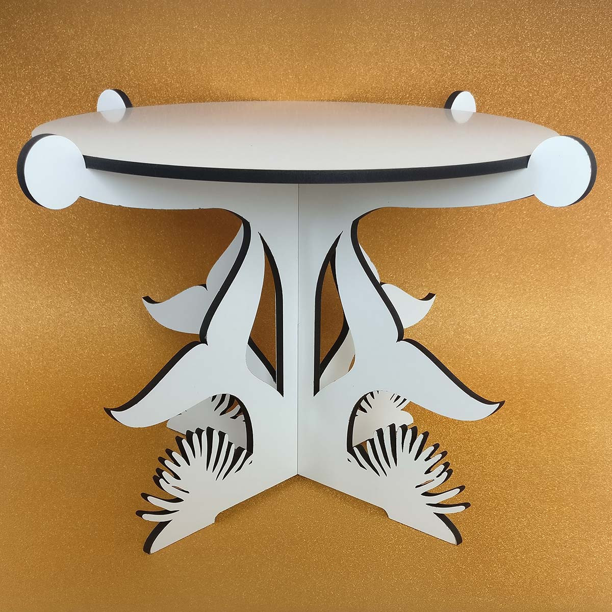 Base branca para pratos ou bolos em mdf laminado com quatro caudas de sereia, um elemento decorativo único para a sua festa. O stand é desmontável e lavável.