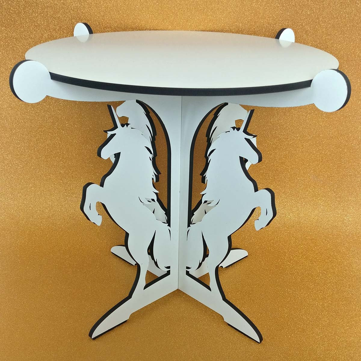 Base branca para pratos ou bolos em mdf laminado com quatro unicórnios, um elemento decorativo único para a sua festa. O stand é desmontável e lavável.
