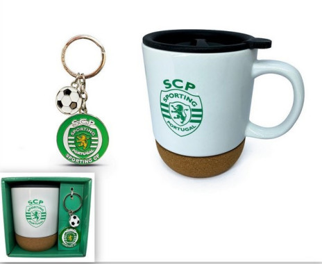 Conjunto do Sporting constituido por caneca cujo fundo é em cortiça e um elegante porta chaves em metal com uma bola de futebol e o símbolo do Sporting Clube de Portugal