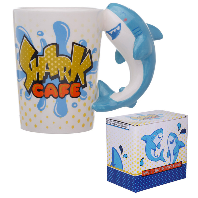Caneca de cerâmica do tubarão com pega em forma de tubarão azul. É um presente muito original. Vem com caixa de oferta.
