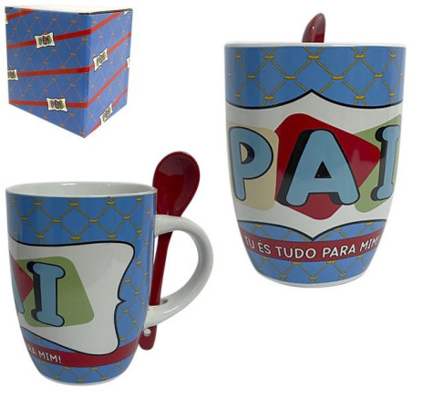 Caneca com colher para oferecer ao pai com a inscrição "Tu És Tudo Para Mim" para oferecer no dia do pai ou noutra data especial, como por exemplo, o aniversário.