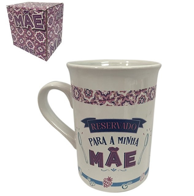Caneca alta em cerâmica para oferecer no dia da mãe. Com a inscrição "Reservado para a minha mãe."