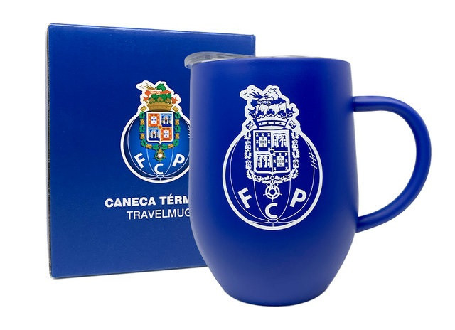 Caneca de viagem térmica do Futebol Clube do Porto com tampa transparente e pega.