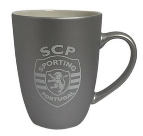 Caneca com toque veludo na cor prata do Sporting Clube de Portugal em cerâmica.
