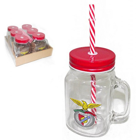 A caneca tem gravada o símbolo do Benfica com uma palhinha com riscas em vermelho e branco.