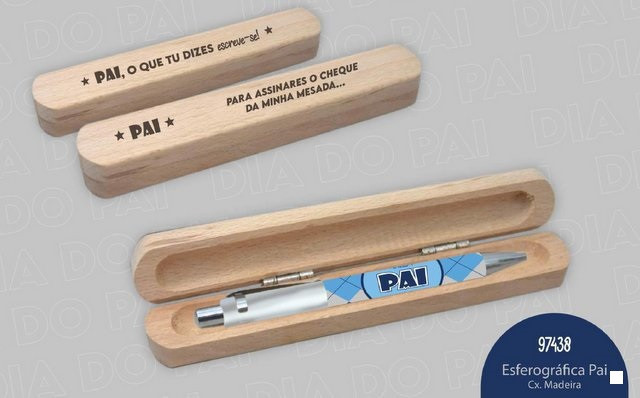 Para oferecer no dia do pai, uma caneta com caixa de madeira, disponível com várias frases.