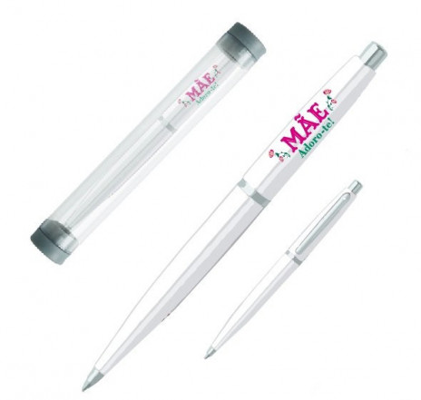 Como presente do dia da mãe, uma caneta esferográfica com a inscrição "Mãe Adoro-te". Com caixinha de oferta.