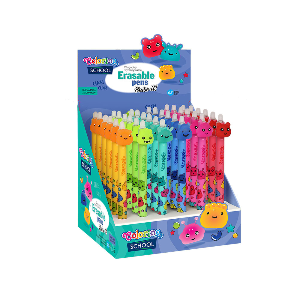 Canetas/esferográficas com desenhos de squishys coloridos, são um ótimo brinde ou oferta para festas de aniversário. A caneta é de tinta azul e ponta grossa (0.5mm). Com fecho automático (sem tampa).