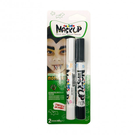 Duas canetas de maquilhagem da Carioca Maskup para pinturas de monstro com 2 cores, branco e preto. A maquilhagem sai facilmente com água e sabão. Testado dermatologicamente.