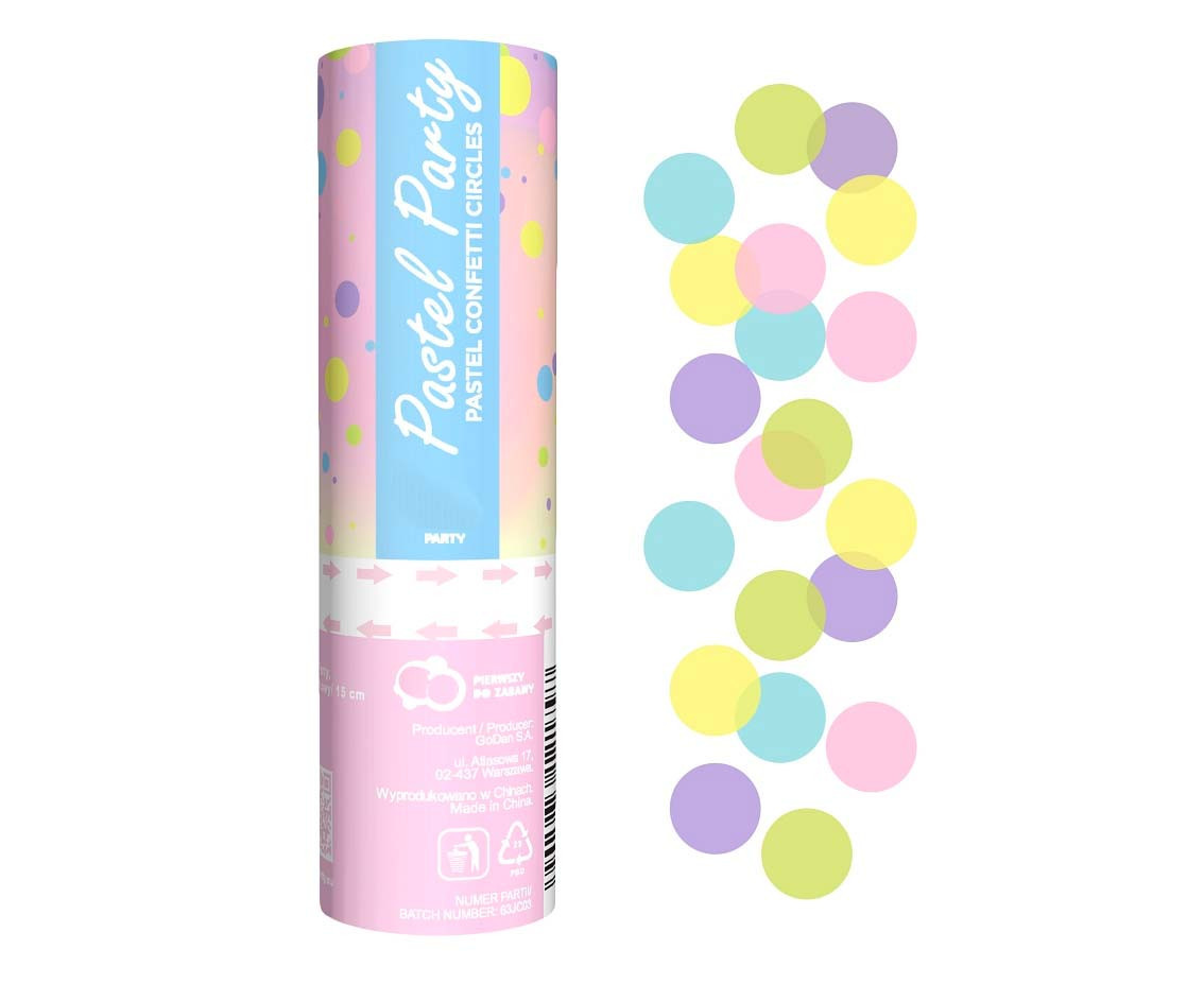 Canhão lança confettis de ar comprimido com 15cm e confettis de cores pastel ótimos para eventos coloridos ou festas unicórnio por exemplo.