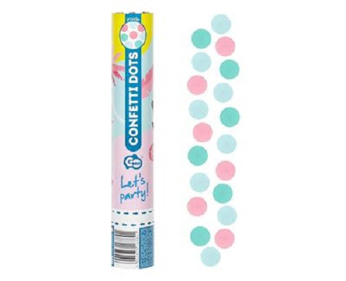 Canhão lança confettis de ar comprimido com 30cm e confettis formato de círculos em cor de rosa, azul e verde.