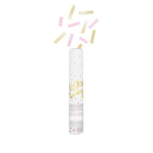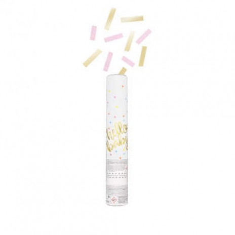 Lança confettis para festa de chá de bebé, baby shower com confettis em cor de rosa. Inclui um tubo de 30cm de disparo de confettis em cor de rosa e dourado. Também disponível em azul.