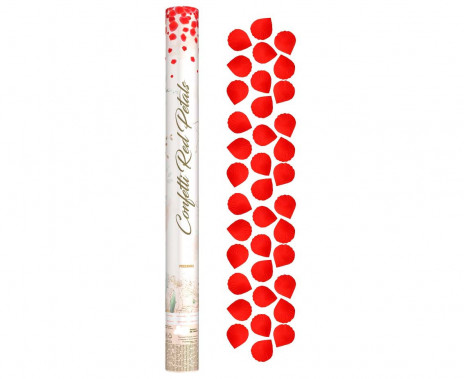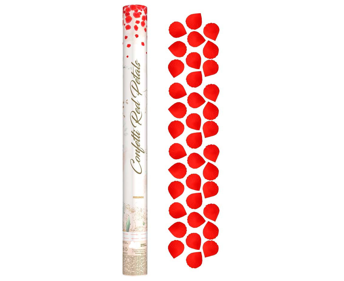 Canhão de ar comprimido lança confettis com pétalas de rosa vermelhas em tecido.