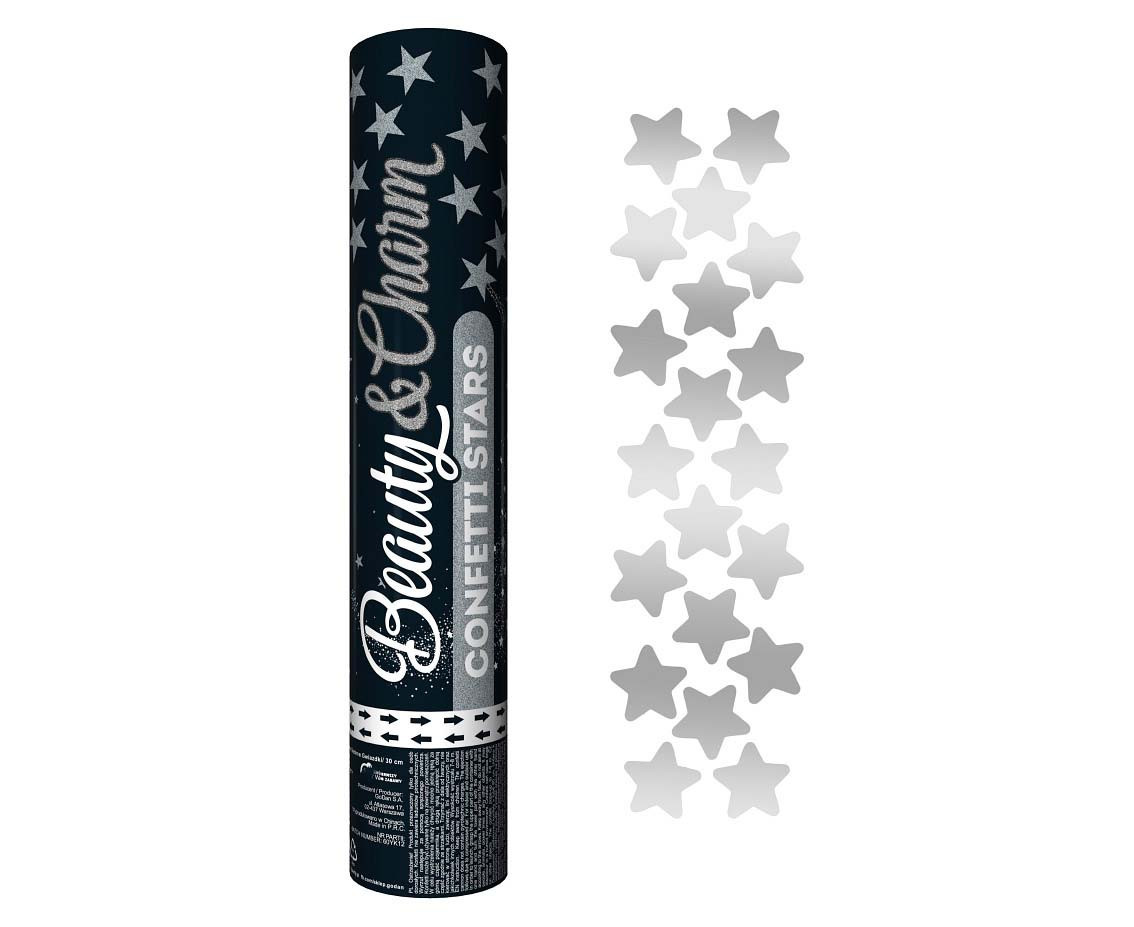 Canhão lança confettis de ar comprimido com 30cm e confettis formato estrelas em prata.