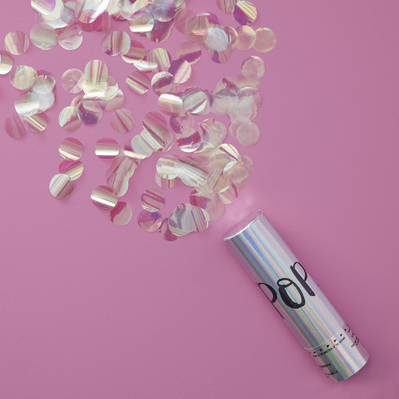 Canhão de ar comprimido lança confetis Iridescent, Uma ótima maneira de adicionar um pouco de pop, brilhar e brilhar para sua próxima festa.