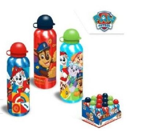 Garrafa em alumínio com tampa plástica da Paw Patrol, com capacidade de 500ml. Disponível em 3 modelos diferentes.