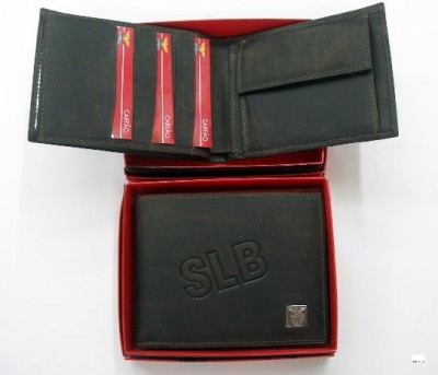 Carteira em pele do Sport Lisboa e Benfica, disponível em duas cores, preto e castanho. Com espaço para cartões, notas e moedas.