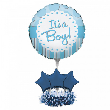 Centro de mesa para baby shower de menino. Inclui 1 balão foil de 18" - 46cm it's a boy, 3 balões de estrelas azuis de 6" - 15.2cm, uma vareta com 15.2cm e a base de 16.5cm. Ideal para o chá de bebé do seu filho.
