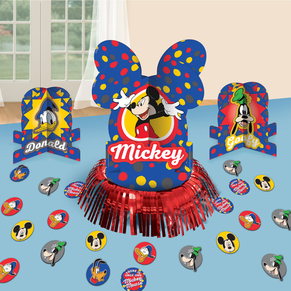 Prepara a tua mesa de aniversário com este kit de decoração do Mickey Mouse, que inclui 1 peça central 35cm, 2 peças 17cm e 20 Confeites de 5cm