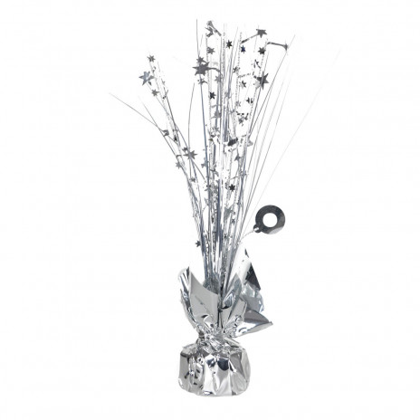 Centro de mesa que inclui peso para balões de cor prateada com estrelinhas, de 5,5cm de diâmetro, que serve para amarrar balões de foil ou látex cheios com hélio.
