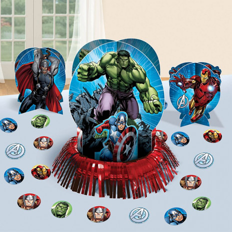 Preparar a tua mesa com este kit de decoração Avengers que inclui um centro de mesa 3D grande, 2 centros mais pequenos e ainda uma série de confetis com simbolos da série.