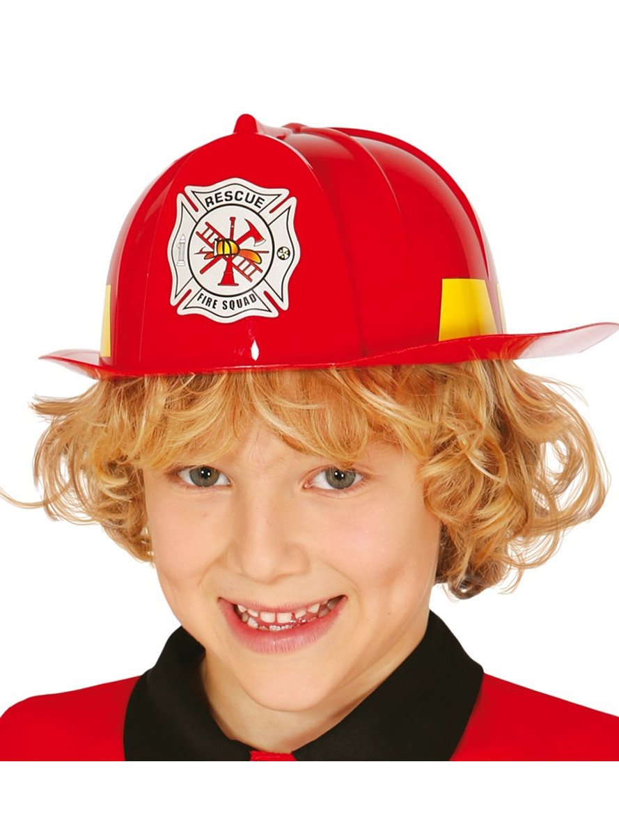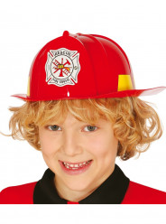 Chapéu em plástico em vermelho com um emblema. No interior do chapéu tem uma banda plástica para ajustar à cabeça da criança.