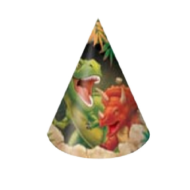 8 chapéus cone do tema Dinossauro, para as tuas festas serem ainda mais divertidas.