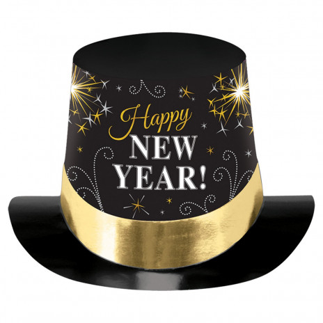 Chapéu tipo cartola para festejar a chegar do novo ano em preto e dourado.