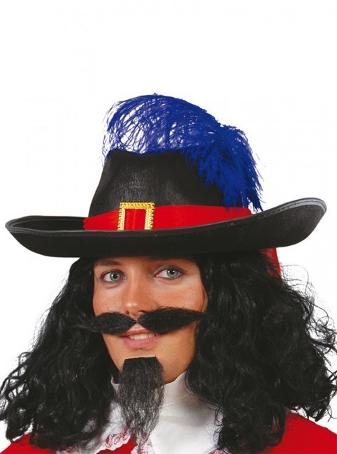 Chapéu de mosqueteiro de cor preta com fita vermelha com fivela dourada e pena em tom de azul, para adolescente.