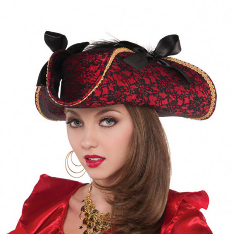 Chapéu tricórnio para mulheres pirata com laços de alta qualidade acetinado com efeitos rendilhados em preto por cima. Inclui uma vistosa pena preta e um acabamento dourado no rebordo.