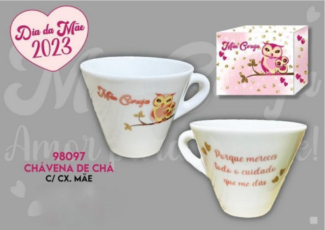 Chávena de chá para oferecer no dia da mãe, com a inscrição "Mãe Coruja".