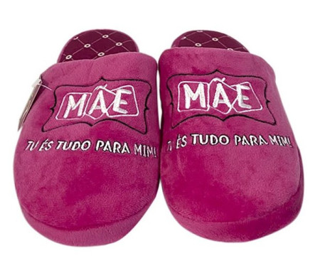 Chinelos de quarto para oferecer no dia da mãe, com a inscrição "Mãe tu és tudo para mim!". Mantém os pés quentinhos.